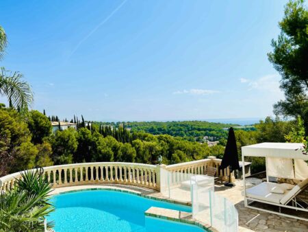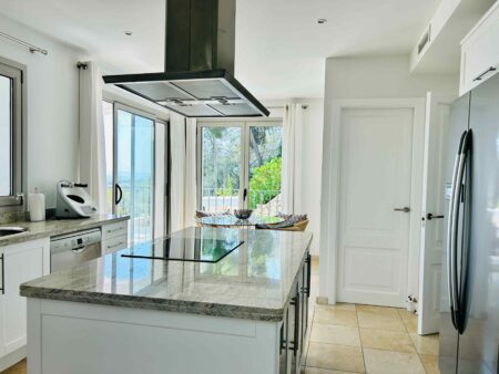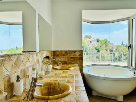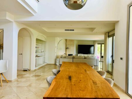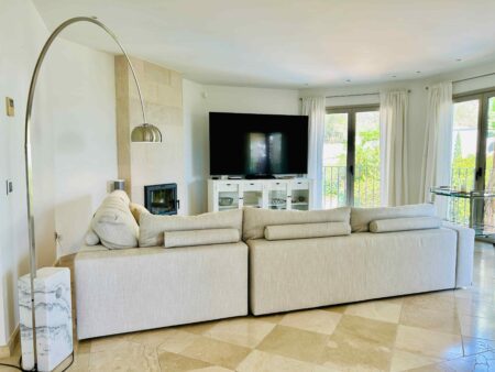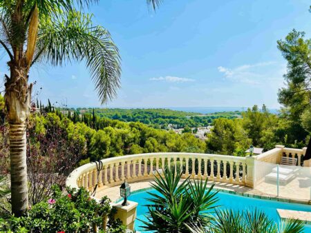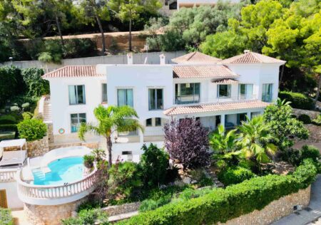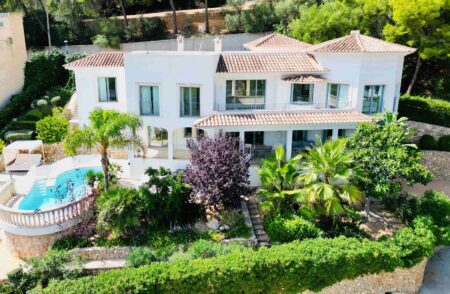 Diese hochwertige Villa befindet sich auf einem erhöhten Grundstück in einer Sackgasse in Portals Nous und bietet beeindruckende Panoramaaussichten auf das Meer und die umliegende Natur. Besonders hervorzuheben ist die fußläufige Nähe zum malerischen Dorf Portals und seinen Annehmlichkeiten. Das Haus hat folgende Aufteilung: Vom Garagenbereich gelangen Sie in den Hauptwohnbereich mit einer vollausgestatteten Küche und einem großzügigen Wohn-Esszimmer mit Kamin, welches Zugang zu einer weitläufigen überdachten Terrasse hat. Von hier aus gelangen Sie leicht zum Pool und den mediterranen Gärten. Auf derselben Etage befindet sich ein Schlafzimmer und ein Badezimmer. Im Obergeschoss liegen drei geräumige Schlafzimmer, alle mit angeschlossenem Badezimmer, sowie eine offene Terrasse. Von dieser Etage aus können Sie die Dachterrasse betreten, die einen atemberaubenden Ausblick bietet. Zusätzliche Merkmale sind: Eine große Garage mit Platz für 4 Autos und Ausbaupotenzial für einen Fitnessraum, Klimaanlage mit Heiz-/Kühlfunktion, beheizter Pool und eine Außensauna. Die Stadt Palma, der Real Golf von Bendinat und der bekannte Yachthafen von Puerto Portals sind nur wenige Autominuten entfernt.