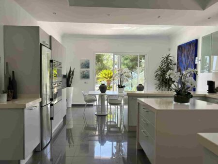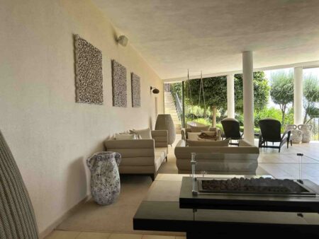 Die untere Etage bietet einen angenehmen, schattigen Chill-Out-Bereich für heiße Tage oder entspannte Abende an der Bar. Zu den weiteren Annehmlichkeiten gehören eine Klimaanlage mit Heiz- und Kühlfunktion, ein offener Kamin, eine automatische Gartenbewässerung, eine Doppelgarage und ein Carport.
