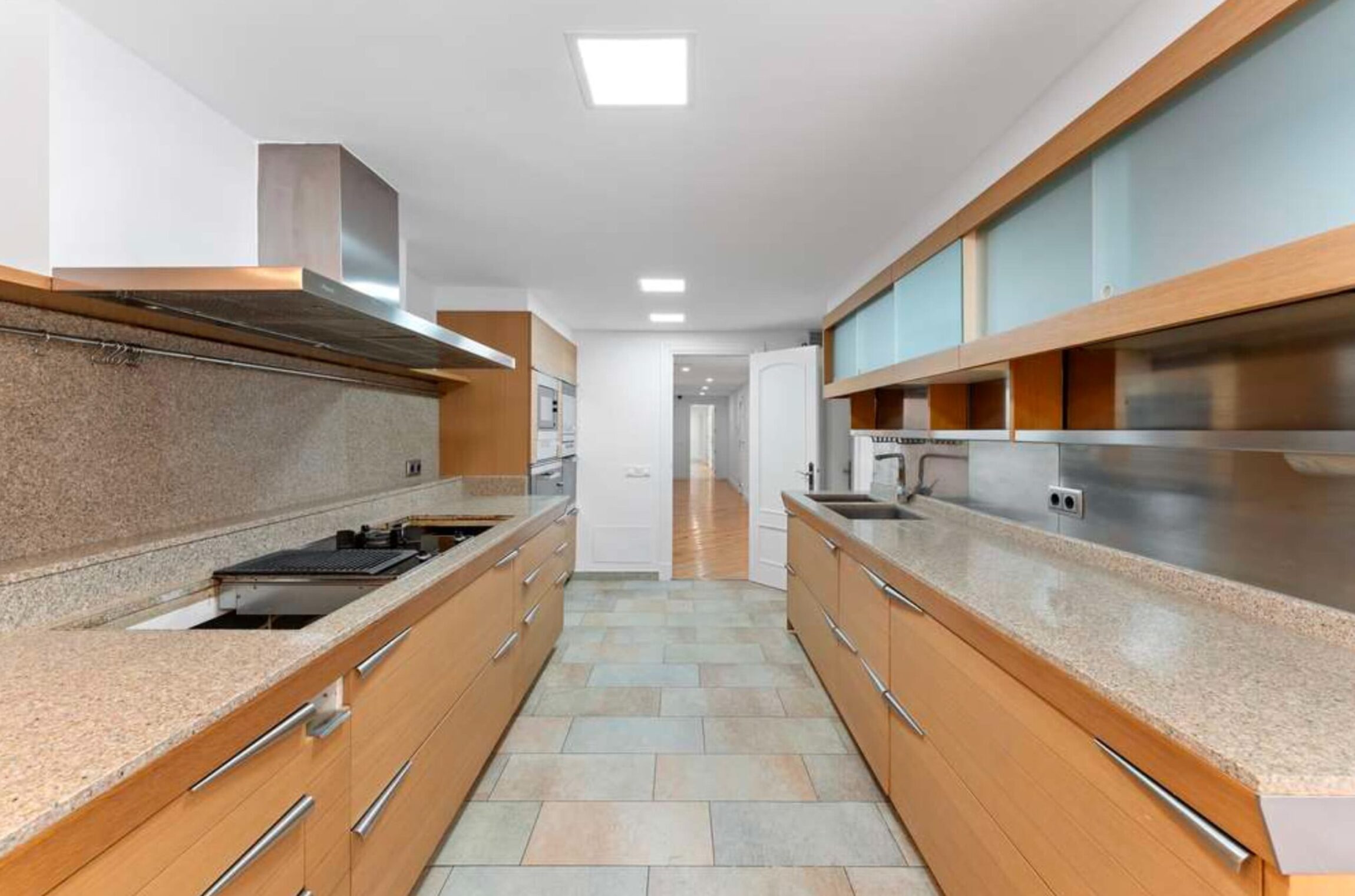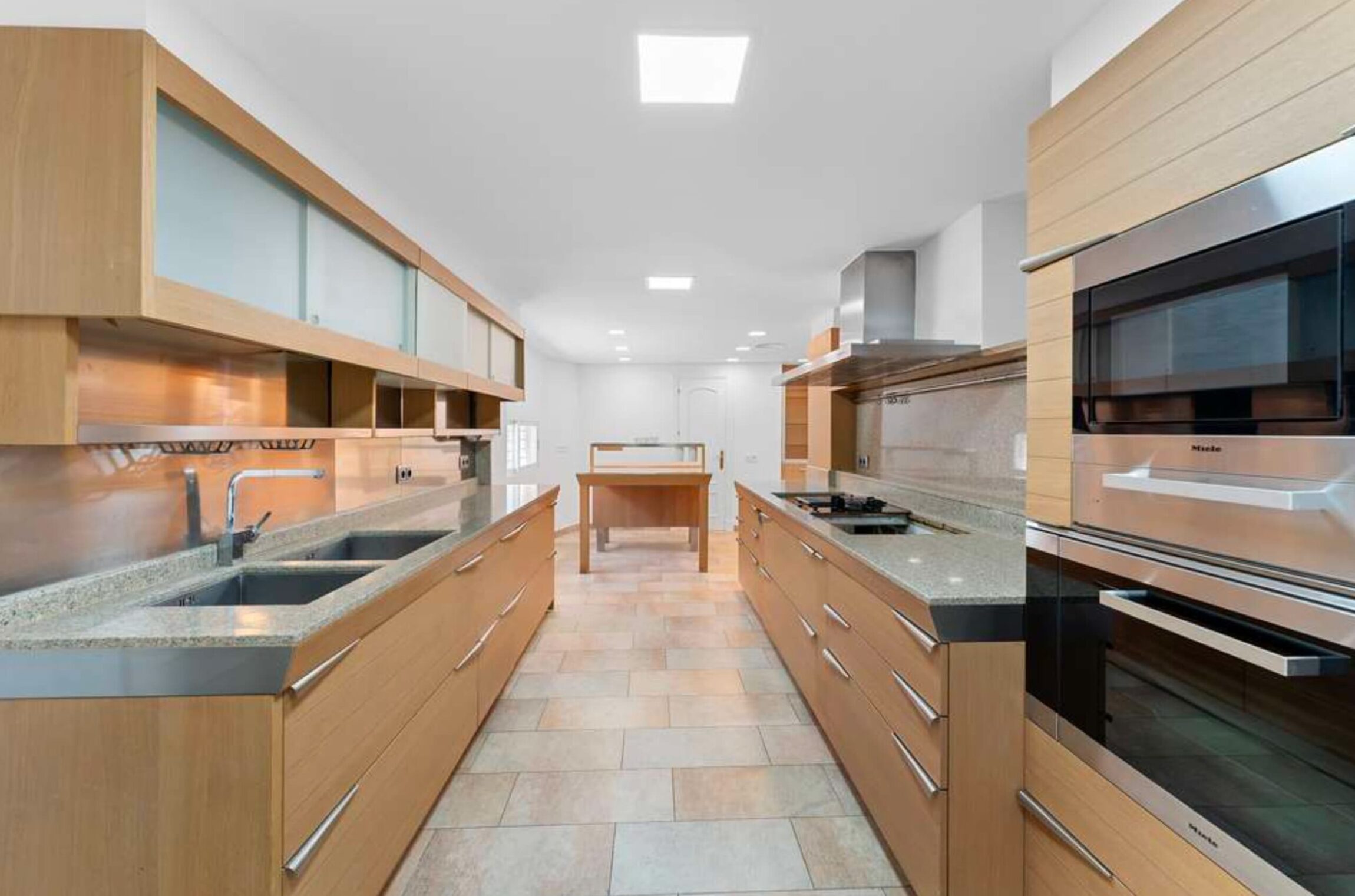 Die hochwertige Küche ist perfekt geplant, mit ausreichend Abstell- und Stauraum und einem stilvollen Tresen für einen gemütlichen Empfang.