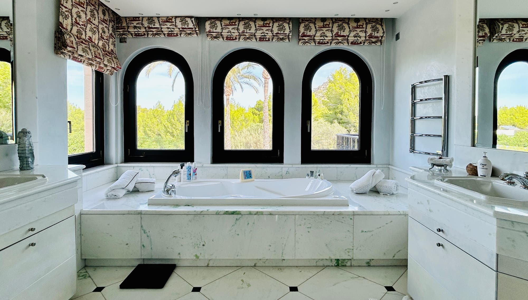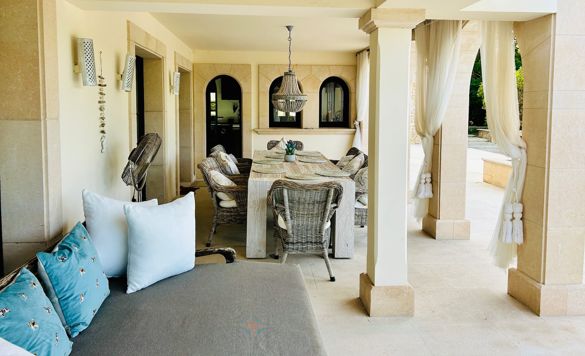 Dieses luxuriöse Anwesen bietet insgesamt sechs Schlafzimmer-Suiten und befindet sich direkt neben einem der Golfplätze in Nova Santa Ponsa. Es eignet sich ideal für Familien als Ferien- oder Ganzjahresresidenz. Das flache Grundstück ist besonders kinder- und tierfreundlich, mit großen Rasenflächen und einem kleinen Fußball- und Spielplatz, die zum Spielen und Toben einladen. Das Herzstück des Gartens ist der großzügige Salzwasserpool, der von einem Poolhäuschen mit einer voll ausgestatteten Außenküche begleitet wird.
