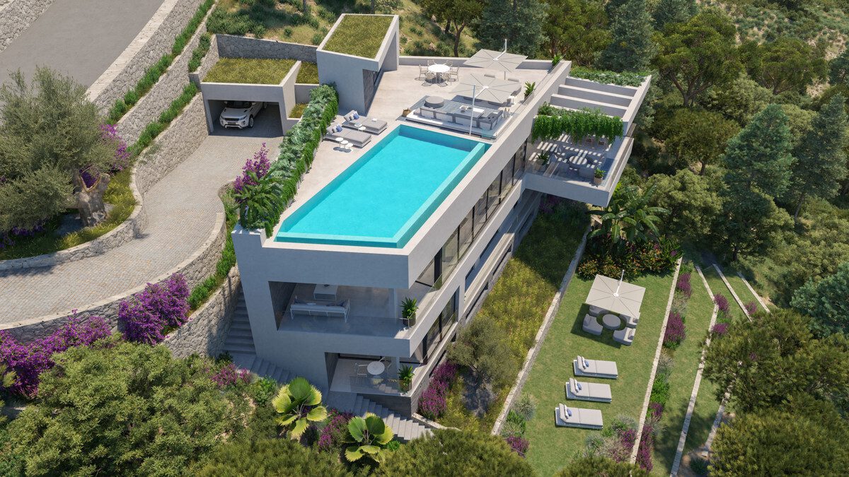 Auf einem großzügigen Grundstück von 2.102 m² erhebt sich diese architektonisch beeindruckende Villa mit einer Wohnfläche von 584 m², verteilt auf zwei Ebenen. Großzügige Fensterfronten fluten die lichtdurchfluteten Räume mit Sonne und öffnen den Blick auf das glitzernde Meer und die idyllische Umgebung.