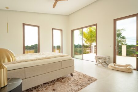 Das Obergeschoss ist dem Masterbereich vorbehalten: ein großzügiges Schlafzimmer mit Bad en Suite und privater Terrasse – ein Rückzugsort mit Panoramablick über das Anwesen.