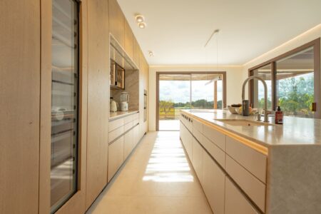 Im Erdgeschoss empfängt Sie ein lichtdurchfluteter Eingangsbereich, der in ein weitläufiges Wohn- und Esszimmer übergeht. Die offene Designerküche der Firma Leicht ist mit BORA-, Miele- und Gaggenau-Geräten ausgestattet und bildet das Herzstück des Hauses. Ergänzt wird dieser Bereich durch zwei Schlafzimmer, ein Bad, ein Gäste-WC, ein Büro sowie einen Hauswirtschaftsraum. Von hier aus gelangen Sie auf die überdachte Terrasse mit Blick auf den spektakulären Salzwasserpool (4×22 m) und den wunderschön angelegten Garten mit Loungearea.