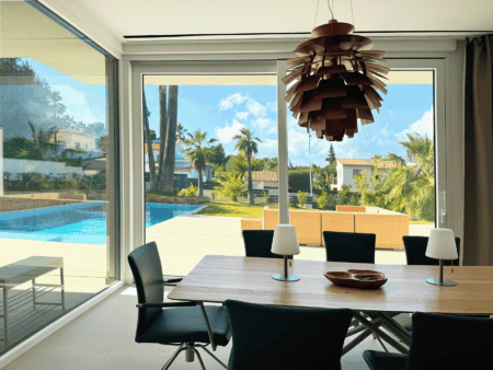 Mit dem Aufzug gelangt man auf die Hauptwohnebene, die sich durch einen offenen Wohn- und Essbereich mit luxuriöser Einbauküche sowie ein Gästeschlafzimmer mit Bad en suite auszeichnet. Große Schiebetüren führen zu den weitläufigen, teils überdachten Terrassen mit einem 50 m² großen Swimmingpool, eingebettet in gepflegte Rasenflächen.