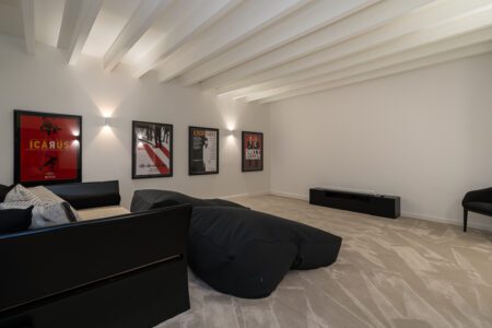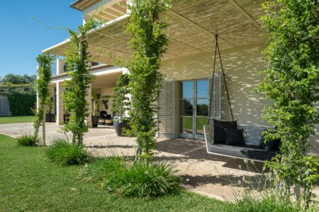 Das Interieur beeindruckt durch edle Natursteinböden, handgefertigte Holzarbeiten und eine harmonische Farbgestaltung. Großflächige, raumhohe Fenster durchfluten die Räume mit Tageslicht und schaffen fließende Übergänge zwischen Innen- und Außenbereich.