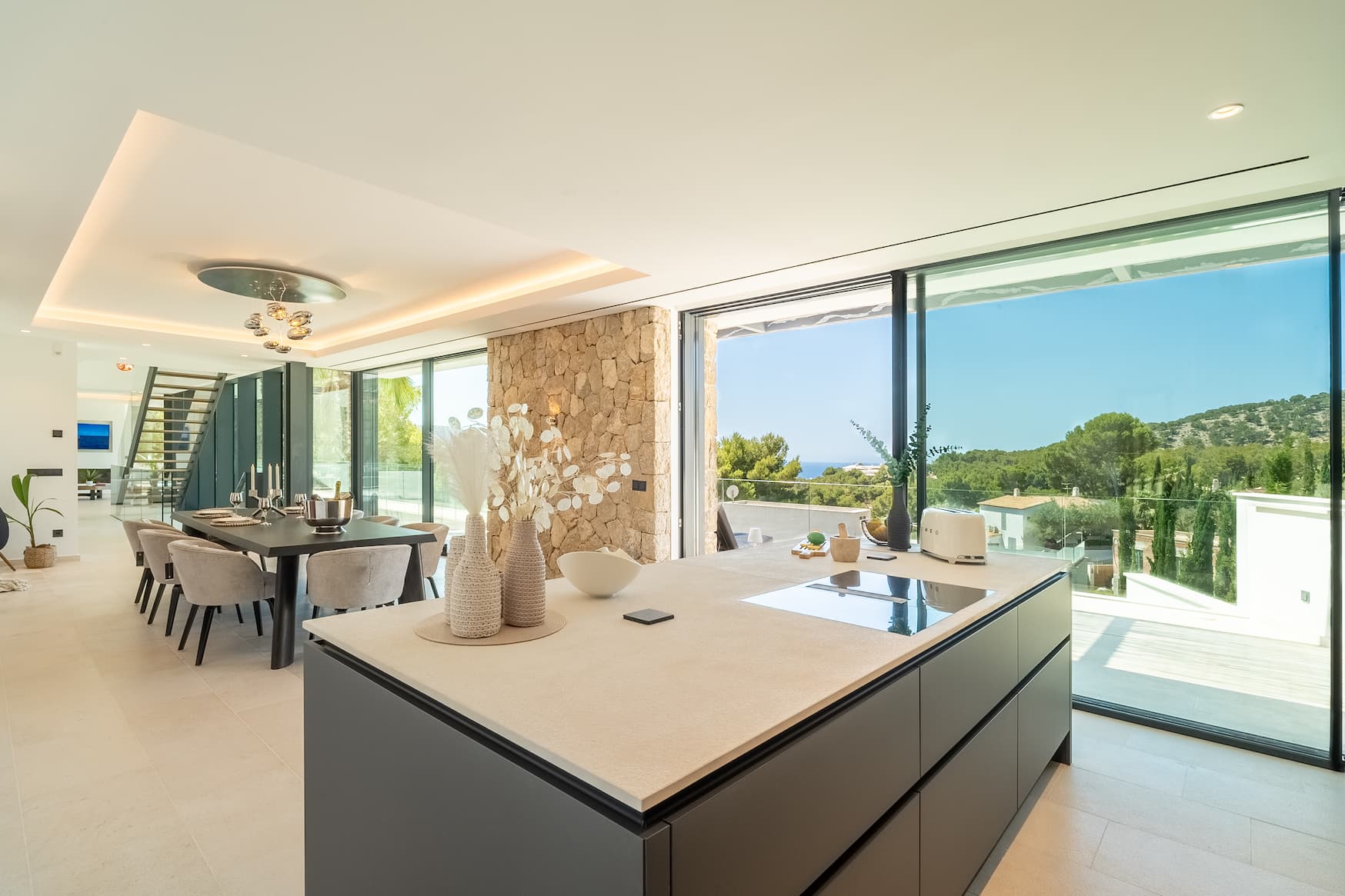 I n der Villa Clavellmar wird zeitgenössische mediterrane Architektur durch eine perfekte Kombination von Leben im Freien und im Haus mit Sonne und Schatten definiert. Ganz nach dem Konzept in Bezug auf Luxus, Stil und Erlesenheit stehen die Innenbereiche im Erdgeschoss nahtlos mit den Außenbereichen in Verbindung. Durch hohe Decken und Panorama Schiebesysteme aus Glas kommt die grandiose Aussicht optimal zur Wirkung.