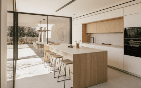 Die Architektur besticht durch eine aufwendig gestaltete Fassade mit mallorquinischem Naturstein und vorgelagerten Holzelementen als Sonnenschutz. Große Glasfronten, ein Eingangsbereich mit doppelter Raumhöhe und elegante, auf Maß gefertigte Details unterstreichen das luxuriöse und dennoch praktische Wohnkonzept.