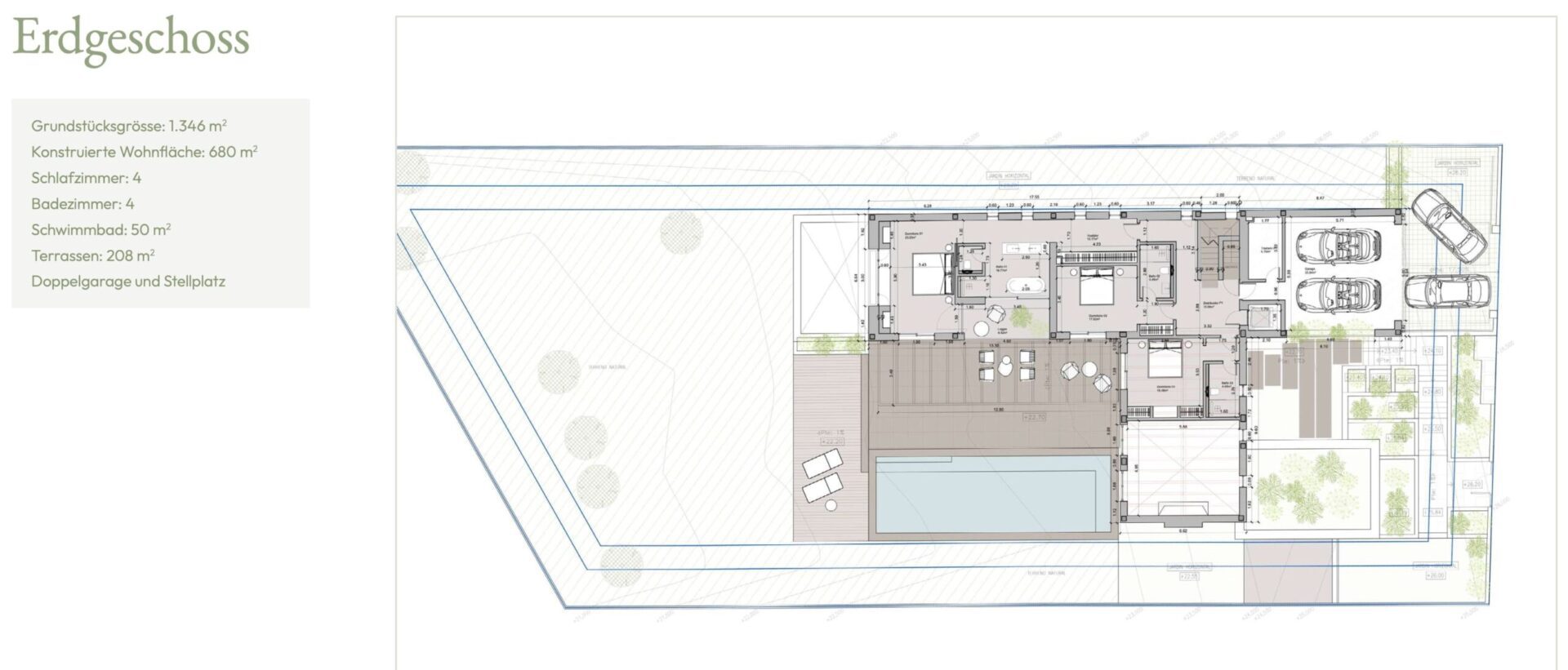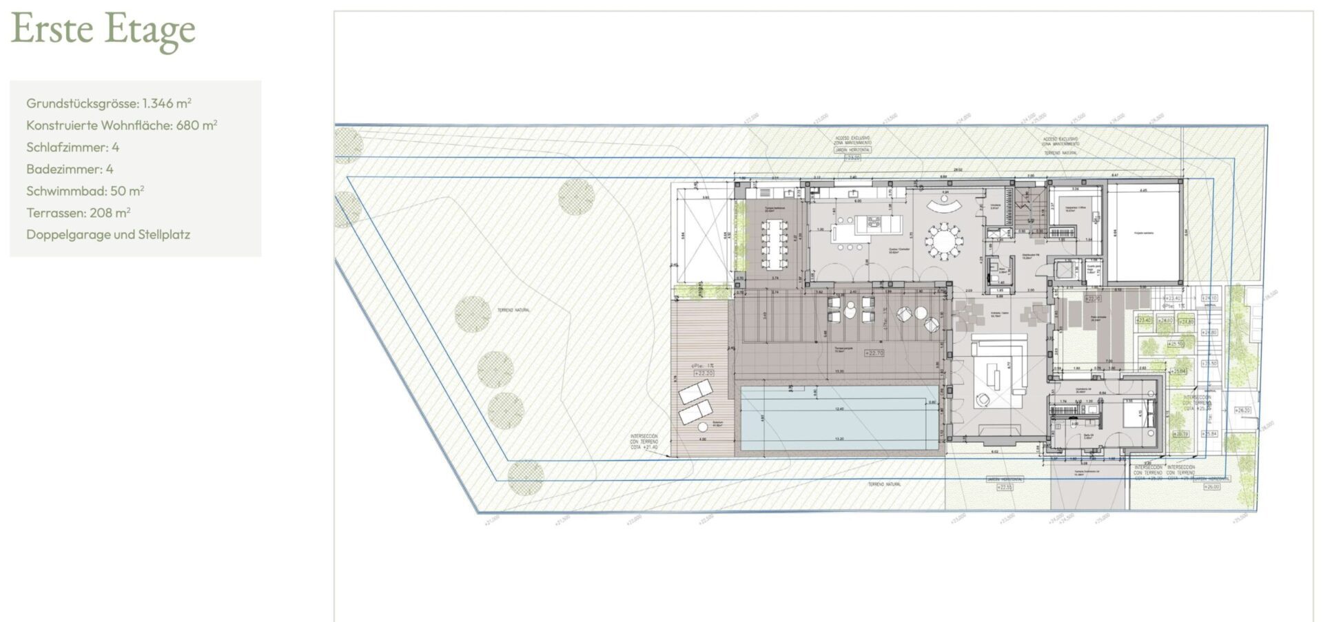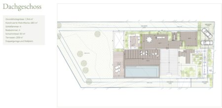 Der Außenbereich ist eine Oase der Ruhe: Ein großzügiger Poolbereich von 50 m², weitläufige Terrassenflächen von insgesamt 208 m² und gepflegte Gartenanlagen bieten Raum für Entspannung und Privatsphäre.