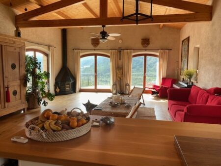 Der lichtdurchflutete Wohn- und Essbereich mit großen Panoramafenstern bietet einen herrlichen Blick auf die umliegenden Berge und sorgt für ein luftiges, offenes Wohngefühl. Die integrierte, voll ausgestattete Küche lädt zum Kochen und Genießen ein. Zwei behagliche Schlafzimmer und zwei elegante Badezimmer bieten komfortables Wohnen auf einer Ebene.