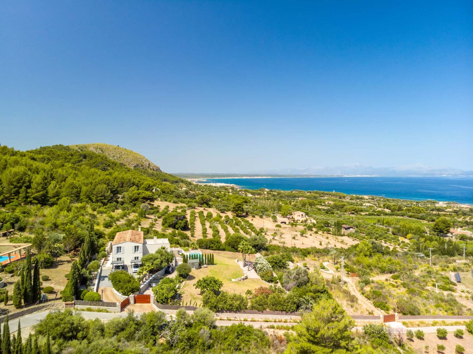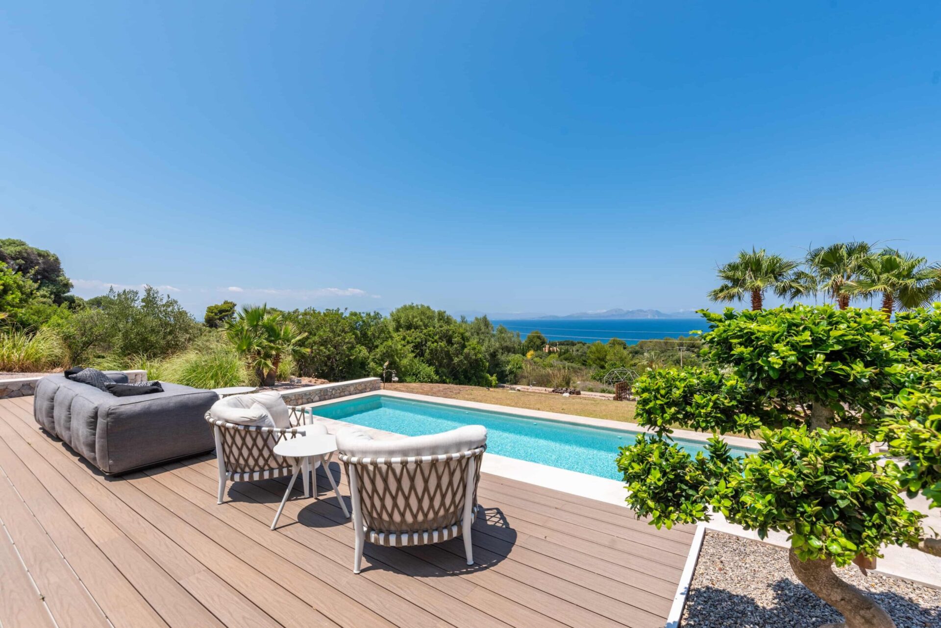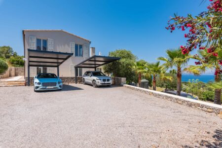 Zwei große elektrische und auch per App bedienbare Tore öffnen sich und Sie werden von einem liebevoll angelegten Grundstück mit einem phantastischen 180 Grad Meerblick und einem einladenden Außenpool sowie großzügigen Terrassen auf mehreren Ebenen begrüßt.