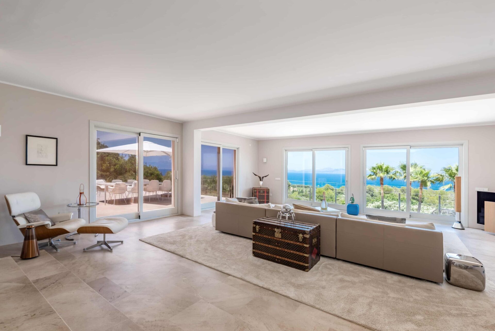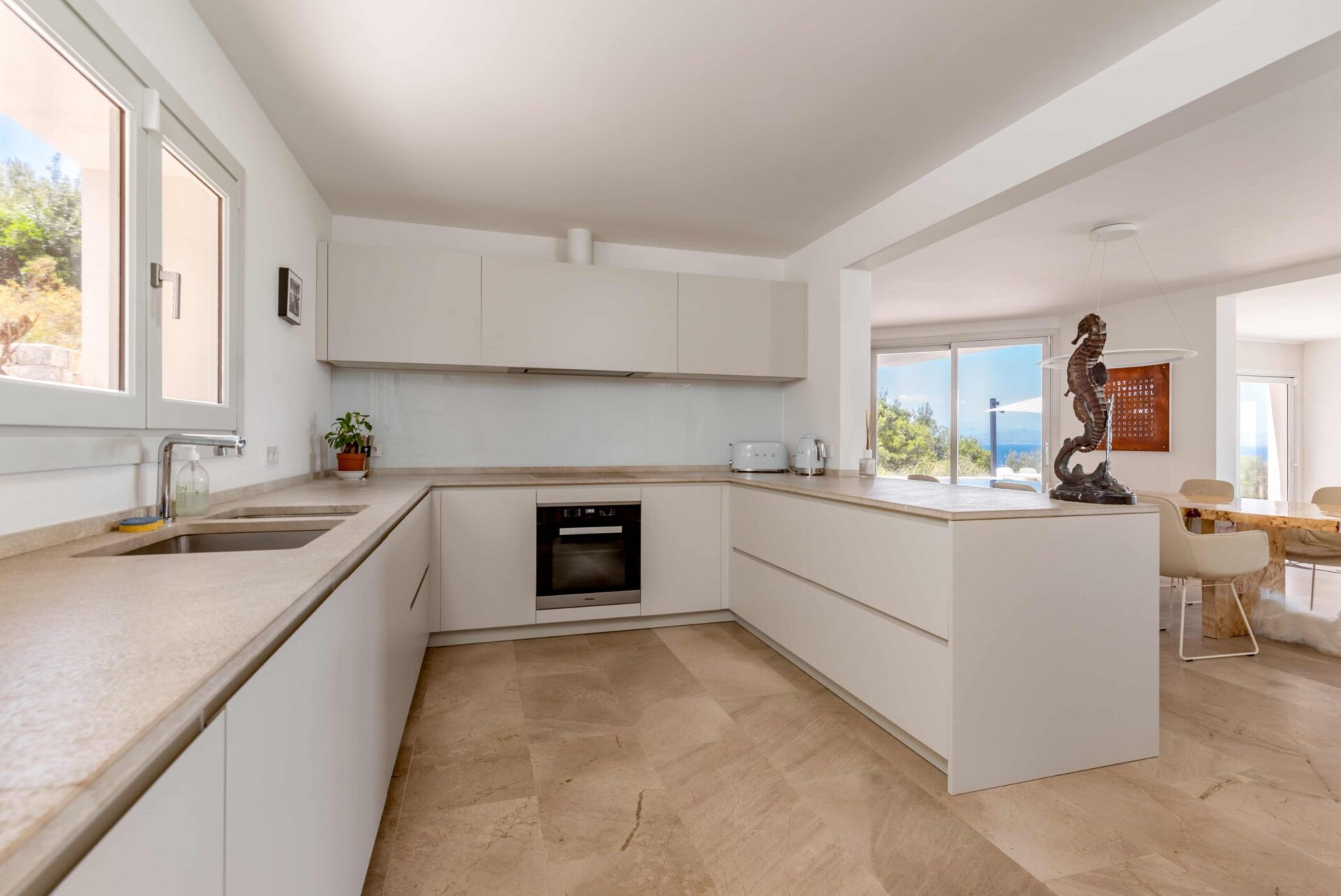 Die Wohnräume sind äußerst großzügig und bieten viel Raum für eine anspruchsvolle Einrichtung. Die Küche ist mit dem Esszimmer verbunden und öffnet sich über 2 Stufen in den großzügigen Wohnbereich mit sensationellen Meerblick.