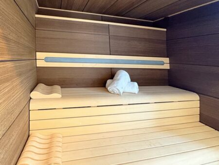 Der elegante Eingangsbereich befindet sich im Obergeschoss, wo sich auch eine Doppelgarage mit direktem Zugang zum Haus befindet. Das luxuriöse Masterschlafzimmer mit Ankleide, Bad en Suite, Sauna und Dampfbad bietet höchsten Komfort. Ebenfalls auf dieser Ebene: ein großzügiges Gästeschlafzimmer mit Bad en Suite und ein multifunktionaler Entertainmentraum, der als weiteres Schlafzimmer genutzt werden kann.