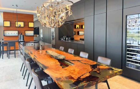 Das Erdgeschoss beeindruckt durch seinen offenen, lichtdurchfluteten Wohn- und Essbereich mit Ethanol-Kamin und Zugang zur weitläufigen Terrasse mit Outdoor-Küche. Der 15 Meter lange, beheizbare Pool bildet das Herzstück des Außenbereichs. Die hochwertige Designerküche mit Kochinsel, ein weiteres Gästezimmer mit Bad, ein stilvolles Büro, ein Gäste-WC sowie ein praktischer Hauswirtschaftsraum komplettieren diese Ebene.