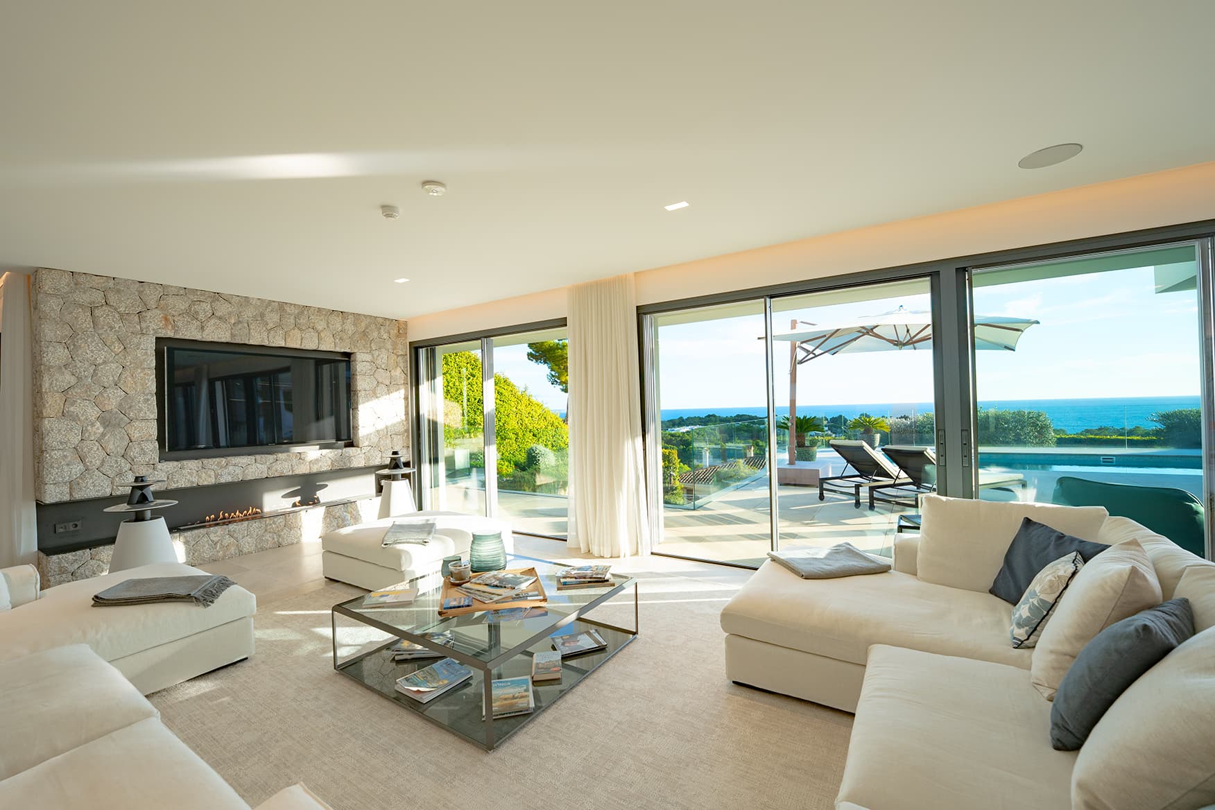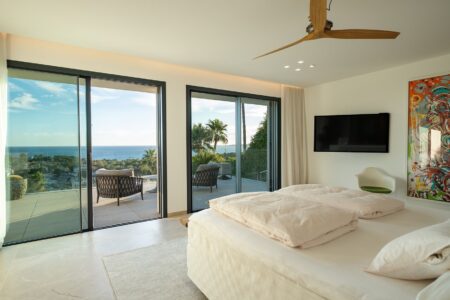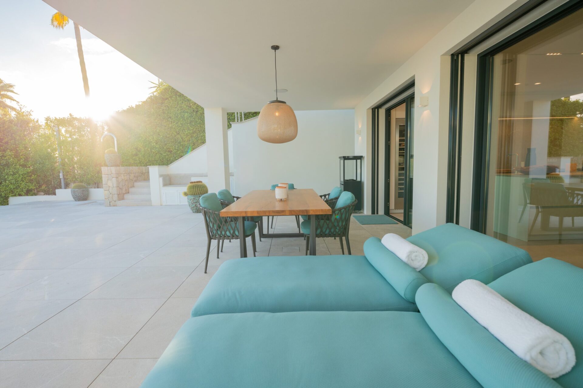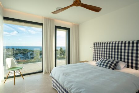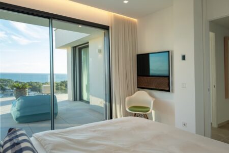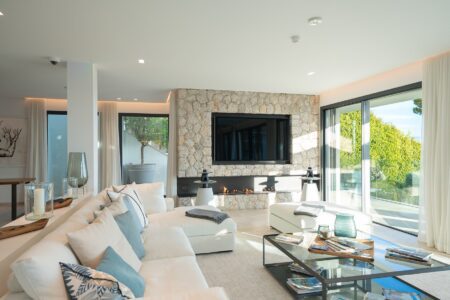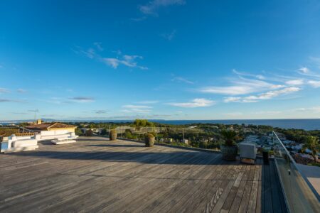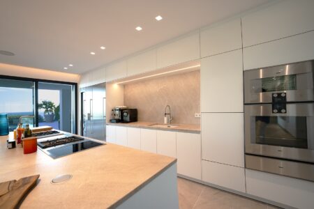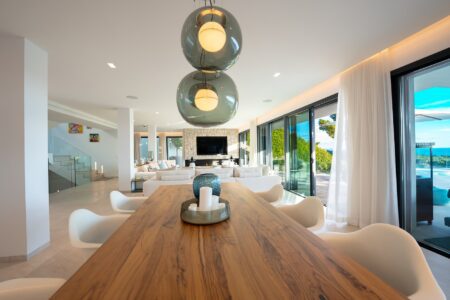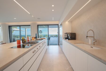 Der großzügige Wohnbereich verbindet sich harmonisch mit der offenen Designer-Küche von Gaggenau, einer weiteren Arbeitsküche sowie dem einladenden Essbereich – alle Räume bieten Zugang zur weitläufigen Terrasse und dem spektakulären Außenbereich. Die sonnige Südwest-Ausrichtung garantiert ganztägig Licht, traumhafte Meerblicke und unvergessliche Sonnenuntergänge.