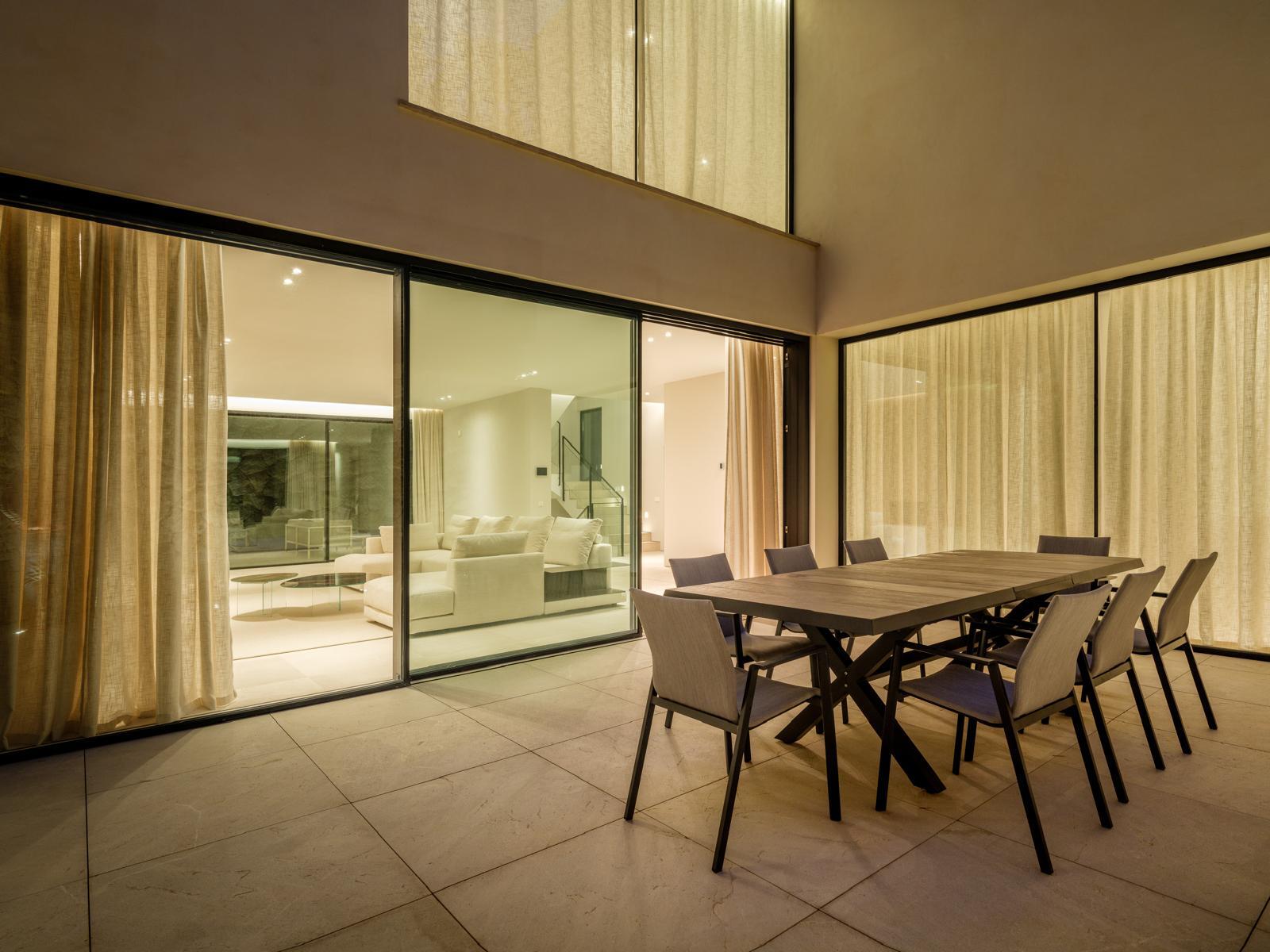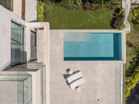 Der offen gestaltete Wohn- und Essbereich im Erdgeschoss überzeugt mit einer luxuriösen Einbauküche und fließendem Übergang zur weitläufigen, überdachten Terrasse, dem eleganten Swimmingpool und dem gepflegten Garten. Ebenfalls auf dieser Ebene befinden sich ein Schlafzimmer mit Bad en suite, ein Gäste-WC, ein Hauswirtschaftsraum sowie ein stilvoll gestalteter Innenhof, der für reichlich Tageslicht sorgt.