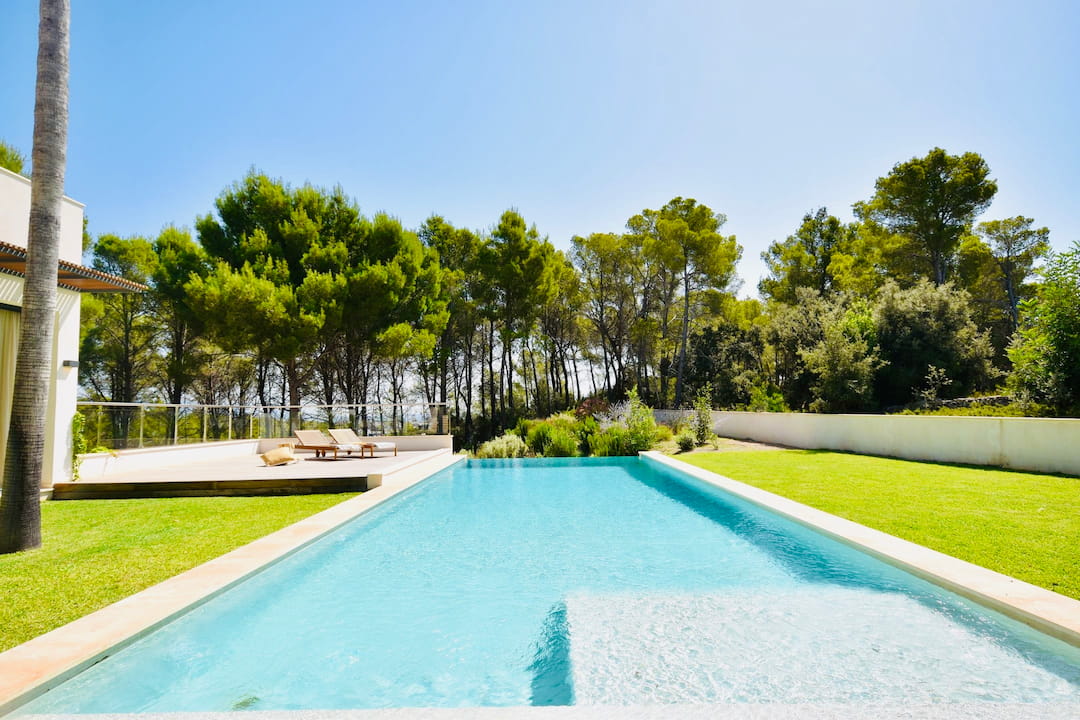 Diese kürzlich große, moderne Villa in Son Vida mit Meerblick in bester Lage verfügt über einen großen, flachen mediterranen Garten mit einer weitläufigen Rasenfläche. Die Villa beeindruckt mit einem großzügigen Außenbereich und einer Außentreppe, die zur Eingangshalle der Villa führt. Der loftartige Wohn-/Essbereich ist dank der bodentiefen Schiebefenster sehr hell. Dieser Bereich umfasst auch eine offene amerikanische Showküche mit Frühstücksinsel und eine Arbeitsküche im hinteren Bereich, ausgestattet mit deutschen Küchengeräten, sowie ein separates Büro mit eigenem Bad. Alle Zimmer auf dieser Etage sind über Terrassen oder Rasenflächen mit dem großzügigen Gartenbereich verbunden. Im Schlaftrakt der Villa befinden sich 2 Gästezimmer mit en-suite Badezimmern, eine Master-Suite mit Badezimmer und privater Sonnenterrasse, die zum quadratischen Salzwasser-Außenpool führt. Im Untergeschoss gibt es eine große Doppelgarage, einen großen Waschraum, zwei Gästesuiten mit Badezimmern und Einbauschränken. Außerdem gibt es ein Fitnessstudio mit Sauna und Badewanne sowie einen separaten Raum für ein Heimkino. Die Villa verfügt über eine große Dachterrasse mit beeindruckendem Meer- und Kathedralenblick. Diese Dachterrasse ist bereits mit einer Pergola ausgestattet und es gibt Anschlüsse für eine Außenküche.
