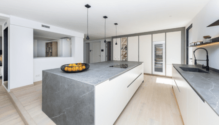 Die auf einem Hanggrundstück liegende Immobilie erstreckt sich im Inneren über zwei Ebenen und besticht im oberen Stockwerk durch ein offenes Wohnkonzept mit fließenden Übergängen zwischen Küche, Wohn- und Essbereich. Durch die hohen und großflächigen Fenster ist es hell und die Atmosphäre wohnlich und freundlich. Im unteren Stockwerk dieser modernen und zugleich zeitlosen Villa befinden sich 3 Schlaf – und 3 Badezimmer, 2 davon ensuite.