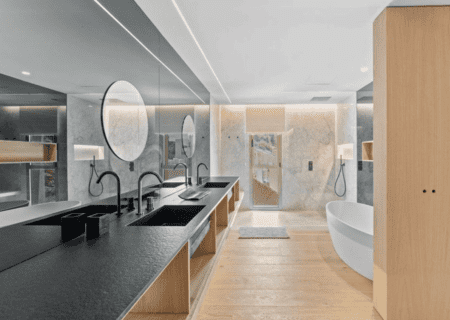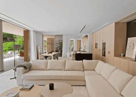 Im Obergeschoss befinden sich vier Schlafzimmer, darunter die luxuriöse Master-Suite mit eigenem Bad und Zugang zur Terrasse. Ein weiteres Schlafzimmer verfügt ebenfalls über ein en-suite Badezimmer, während die verbleibenden beiden Schlafzimmer ein gemeinsames Bad teilen. Alle Schlafräume bieten Zugang zu einer Terrasse und bestechen durch Holzböden, die eine warme, einladende Atmosphäre schaffen.