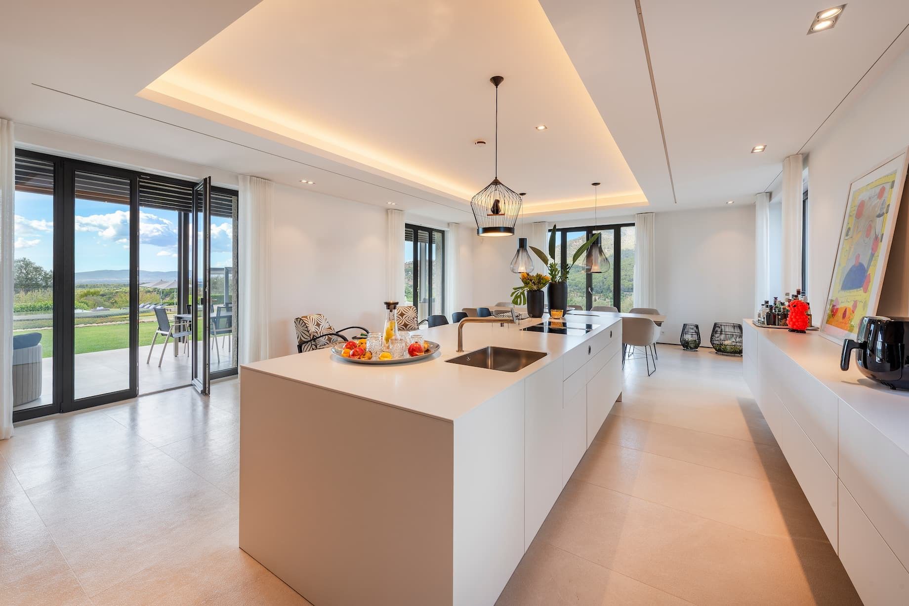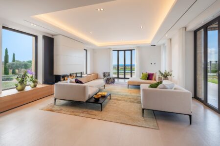 Durch bodenhohe Fenster und großzügige Glasfronten fließen Licht und Natur in jeden Raum. Das architektonische Konzept „frames the view“ lässt Innen- und Außenräume elegant ineinander übergehen. Die Natursteinfassade in traditioneller Handwerkskunst unterstreicht den hochwertigen Anspruch und harmoniert perfekt mit der umliegenden mediterranen Landschaft.