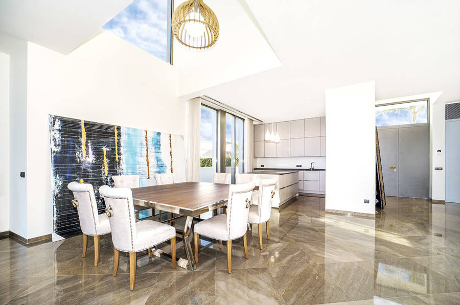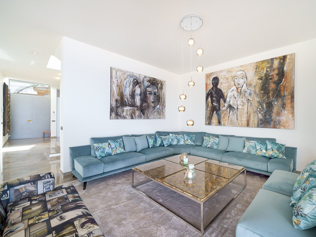 Die luxuriöse Villa, die Sie hier betrachten, ist ein wahrhaft atemberaubendes Beispiel moderner Architektur und befindet sich in einer privilegierten Lage oberhalb des Port Adriano Yachthafens. Mit einer makellosen Ausstattungsqualität und höchsten Baustandards ist diese Villa ein Meisterwerk der modernen Architektur. Die Wohnräume im Erdgeschoss sind großzügig bemessen und bieten viel Platz zum Entspannen und Genießen. Ein großer Wohn- und Essbereich mit offener Küche schafft eine einladende Atmosphäre, während eine Gästetoilette das Angebot abrundet.