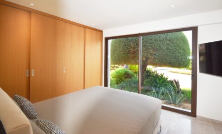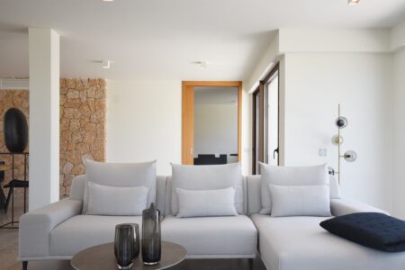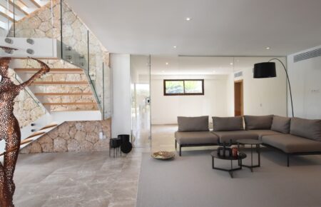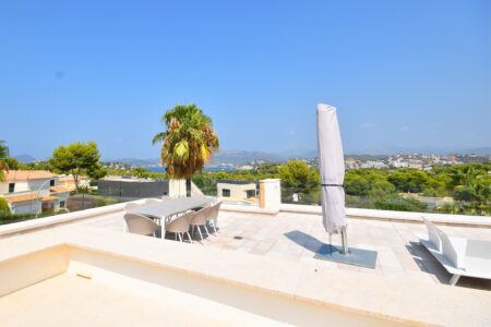 Diese beeindruckende Villa in der Südwestregion vereint modernes Design mit mediterranem Flair. Die Immobilie besticht durch ihre geradlinige Architektur und hochwertige Ausstattung, die sich in den Natursteinelementen und luxuriösen Materialien widerspiegeln. Mit einer Gesamtfläche von 448 ㎡ und einer großzügigen Wohnfläche von 437 ㎡ bietet das Haus viel Platz für komfortables Wohnen. Die Villa verfügt über vier geräumige Schlafzimmer und vier moderne Badezimmer, von denen zwei en suite sind. Die weitläufigen Außenanlagen laden zum Entspannen ein, besonders auf der Dachterrasse mit Jacuzzi, von der aus man einen atemberaubenden Blick auf die Bucht von Santa Ponsa und das Tramuntana-Gebirge genießen kann. Ein Highlight des Außenbereichs ist der Salzwasser-Swimmingpool.