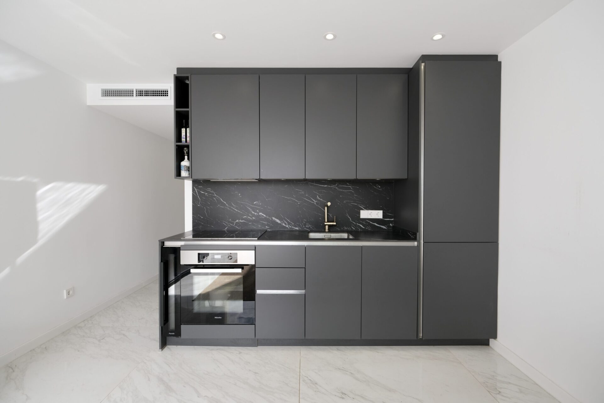 Die Wohnung verfügt über zwei Schlafzimmer mit Einbauschränken und zwei Badezimmer, von denen eines ein eigenes Bad ist. Die moderne, voll ausgestattete Küche geht nahtlos in den offenen Wohn- und Essbereich über und führt zu einer großzügigen Terrasse mit Grillmöglichkeit, die den Raum mit natürlichem Licht durchflutet. Im hinteren Bereich befindet sich ein intimer Innenhof, der für einen Hauch von Ruhe sorgt. Die Wohnung wird möbliert verkauft und verfügt über einen Abstellraum und eine Tiefgarage.