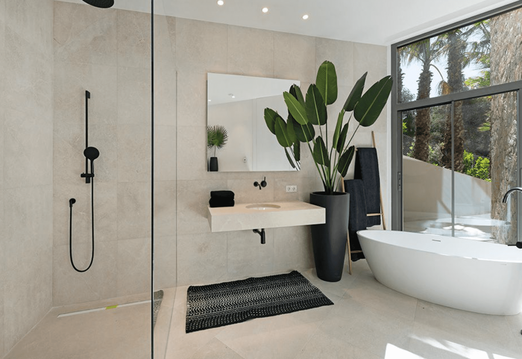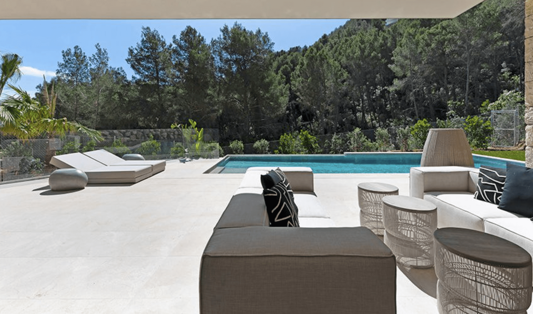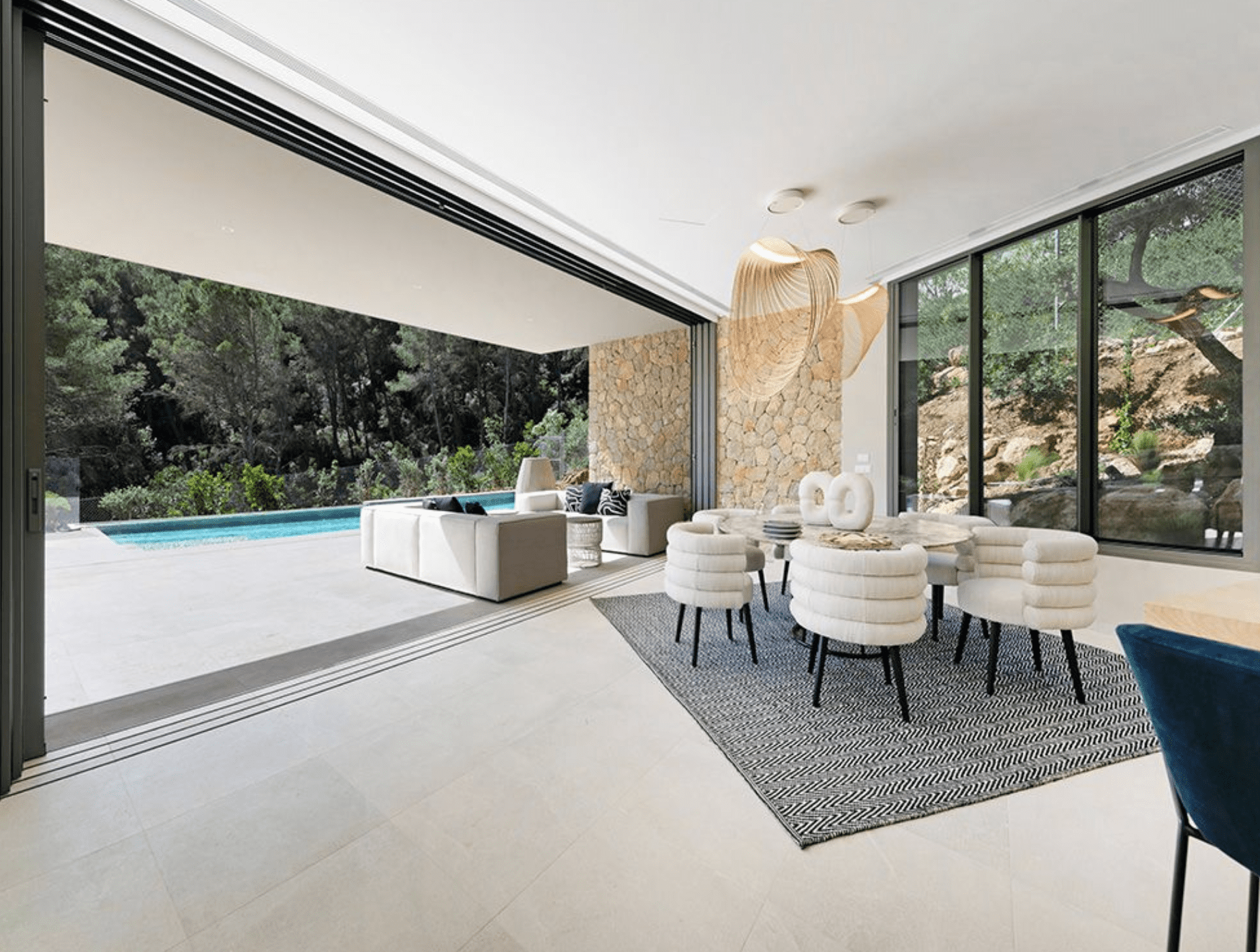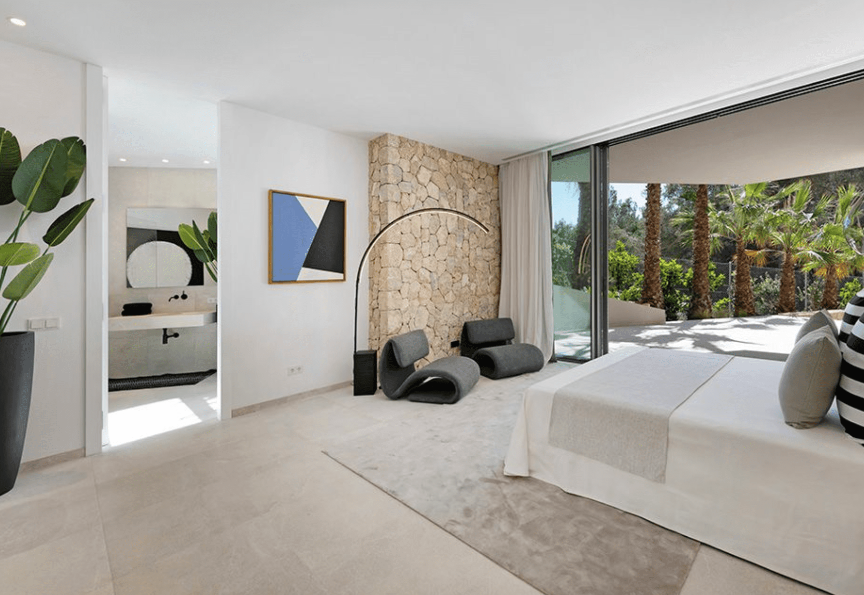 Im Obergeschoss befinden sich das Hauptschlafzimmer mit begehbarem Kleiderschrank und luxuriösem Bad sowie zwei weitere Doppelschlafzimmer, jeweils mit eigenem Bad und spektakulärem Blick auf den Wald und den Pool. Ein besonderes Highlight der Villa ist die Dachterrasse mit fantastischem Blick auf Palma, ausgestattet mit einem Grillplatz, einer gemütlichen Sitzecke und einer Feuerstelle – der perfekte Ort für Mahlzeiten im Freien und gesellige Abende.