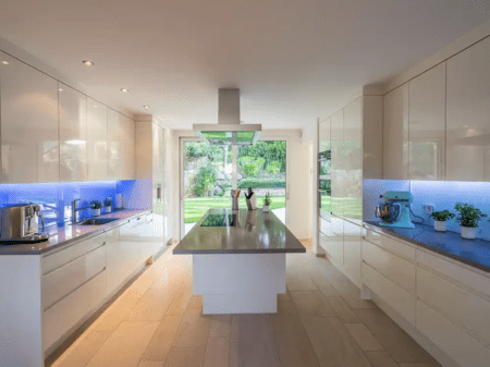 Im Erdgeschoss erwartet Sie ein gemütlicher Wohnbereich mit einer Gas-Feuerstelle, der eine warme und einladende Atmosphäre schafft. Die voll ausgestattete Küche, ausgestattet mit hochwertigen Gaggenau-Geräten, geht nahtlos in den Essbereich über. Ein Hauswirtschaftsraum und eine Speisekammer bieten zusätzlichen Stauraum und Komfort. Zudem befinden sich auf dieser Ebene zwei großzügige Schlafzimmer, jeweils mit eigenem Badezimmer en Suite, sowie ein Gäste-WC.