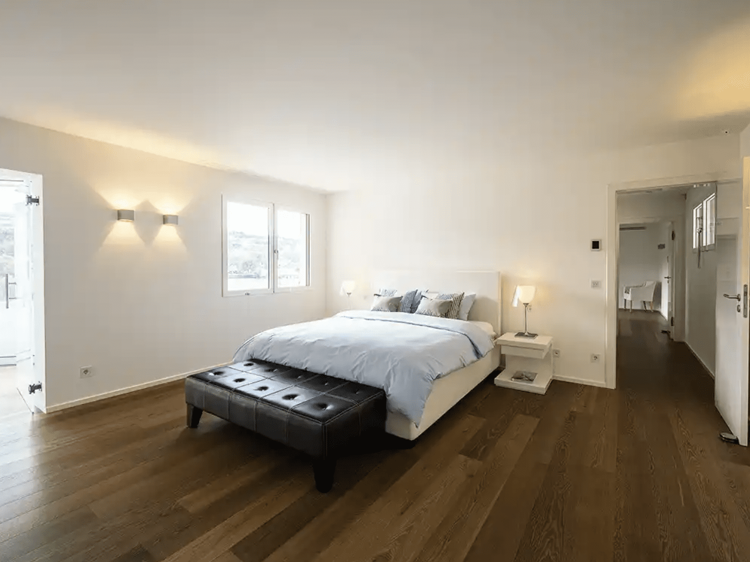 Im Obergeschoss befindet sich das Hauptschlafzimmer mit Ankleide, das höchsten Ansprüchen gerecht wird. Ein weiteres Gästeschlafzimmer, ebenfalls mit eigenem Bad en Suite, bietet zusätzlichen Platz für Familie oder Gäste.