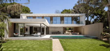 Casa Hollywood auf Ibiza ist ein Meisterwerk der modernen Architektur und Technologie, das in seiner exklusiven Lage in Siesta, Santa Eulalia del Río, überwältigende Aussichten auf das Mittelmeer und den Hafen bietet. Dieses 2020 fertiggestellte Anwesen vereint avantgardistische Architektur mit feinster deutscher Handwerkskunst, umgeben von der natürlichen Schönheit Ibizas. Es erstreckt sich über eine beeindruckende Wohnfläche von ca. 750 m² und bietet zusätzlich ca. 600 m² an Terrassenfläche, die ein luxuriöses und großzügiges Wohnambiente in vollkommener Privatsphäre ermöglichen.